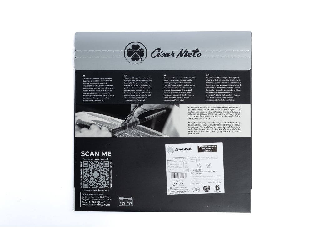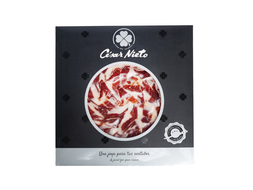 Šunka zraje po dobu více než 48 měsíců ve sklepích, čímž získává intenzivní a komplexní aroma. Její charakteristickou vlastností je vysoký podíl zdravé kyseliny olejové a jemná textura, která se na patře doslova rozplývá. Produkt je dodáván ručně krájený mistry kráječi, což zajišťuje zachování maximálního aroma a perfektní prezentaci.