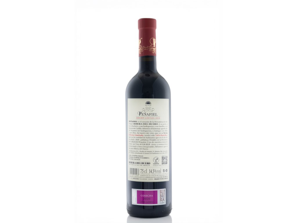 Toto víno Peñafiel Edición Limitada z ročníku 2020 je elegantní červené víno s chráněným označením původu D.O. Ribera del Duero ze Španělska, které je vyrobeno ze 100% odrůdy Tempranillo z vinic ve vysoké nadmořské výšce v okolí Peñafielu. Víno zrálo 18 měsíců v sudech z francouzského dubu, což mu dodává komplexnost a charakter.